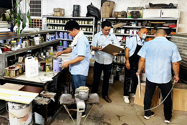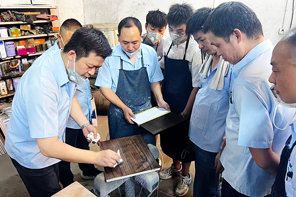 理論課程后,趙副理帶領(lǐng)大家投入色板制作實戰(zhàn)。從白胚檢查、砂光處理,到底色施工、底漆噴涂、修色及面漆完工,每一個環(huán)節(jié)都結(jié)合產(chǎn)品特性與配比要求進行實操演練,幫助大家真正掌握完整工藝流程,提升在實際服務(wù)中的應(yīng)對能力。